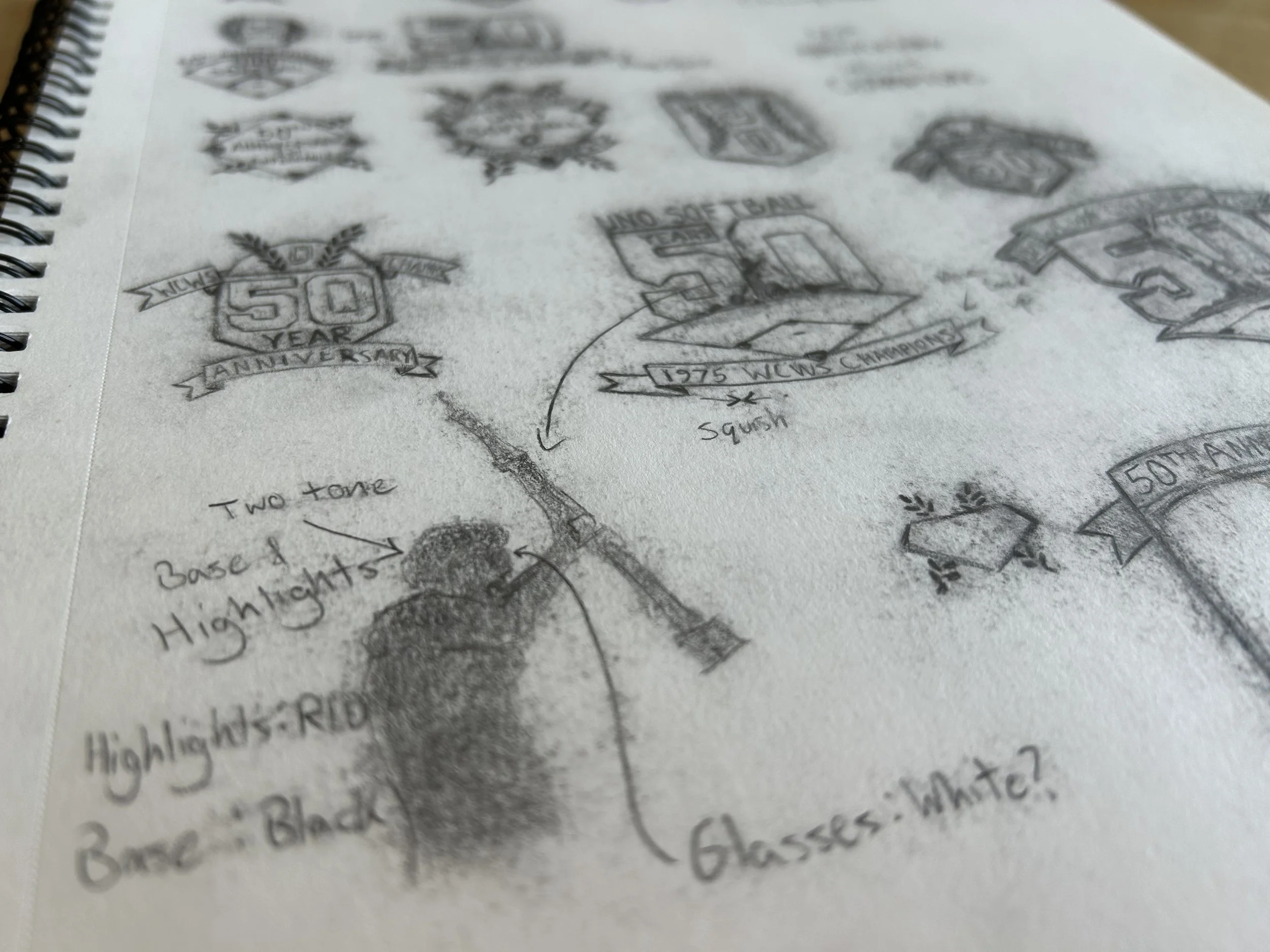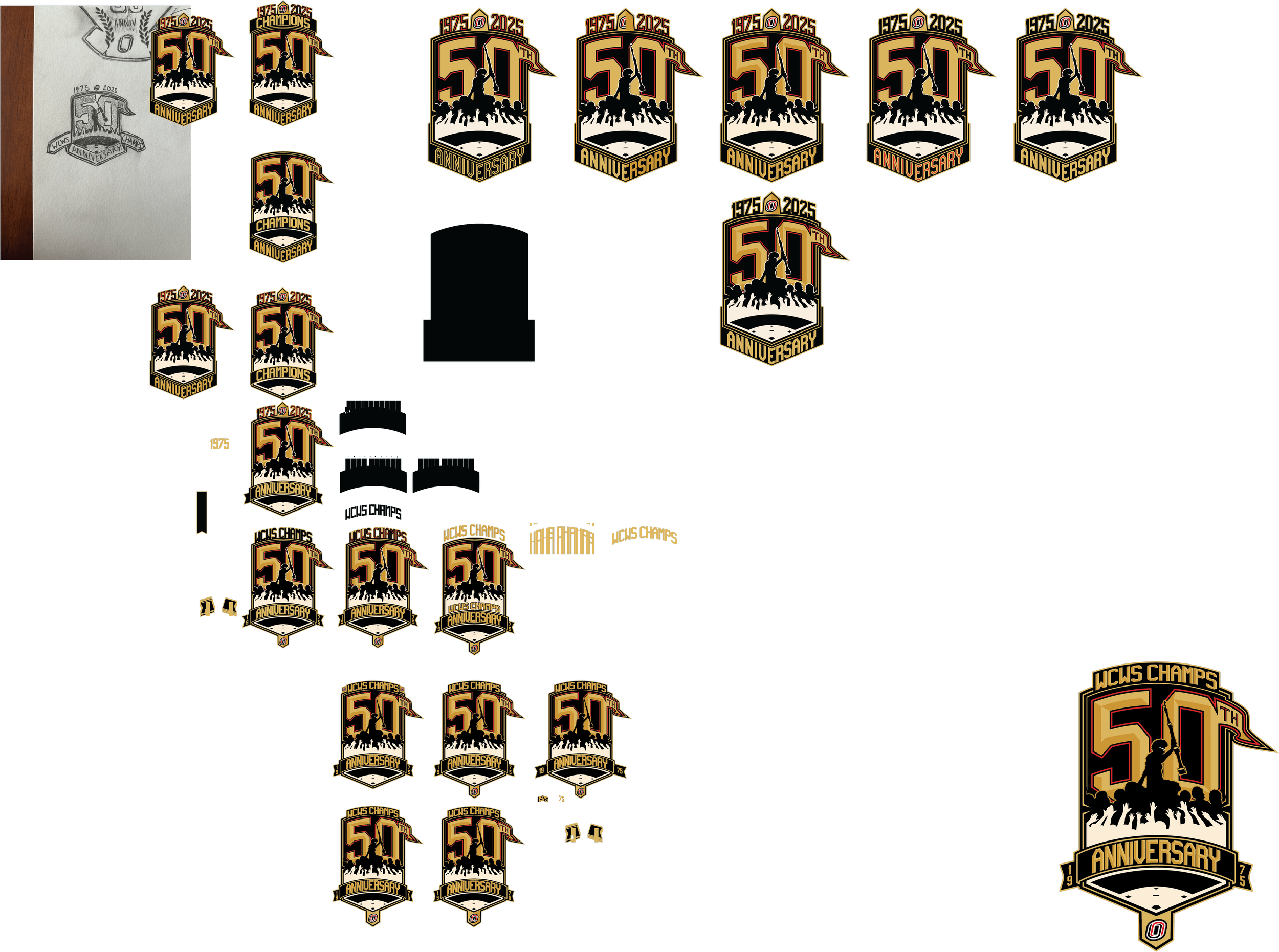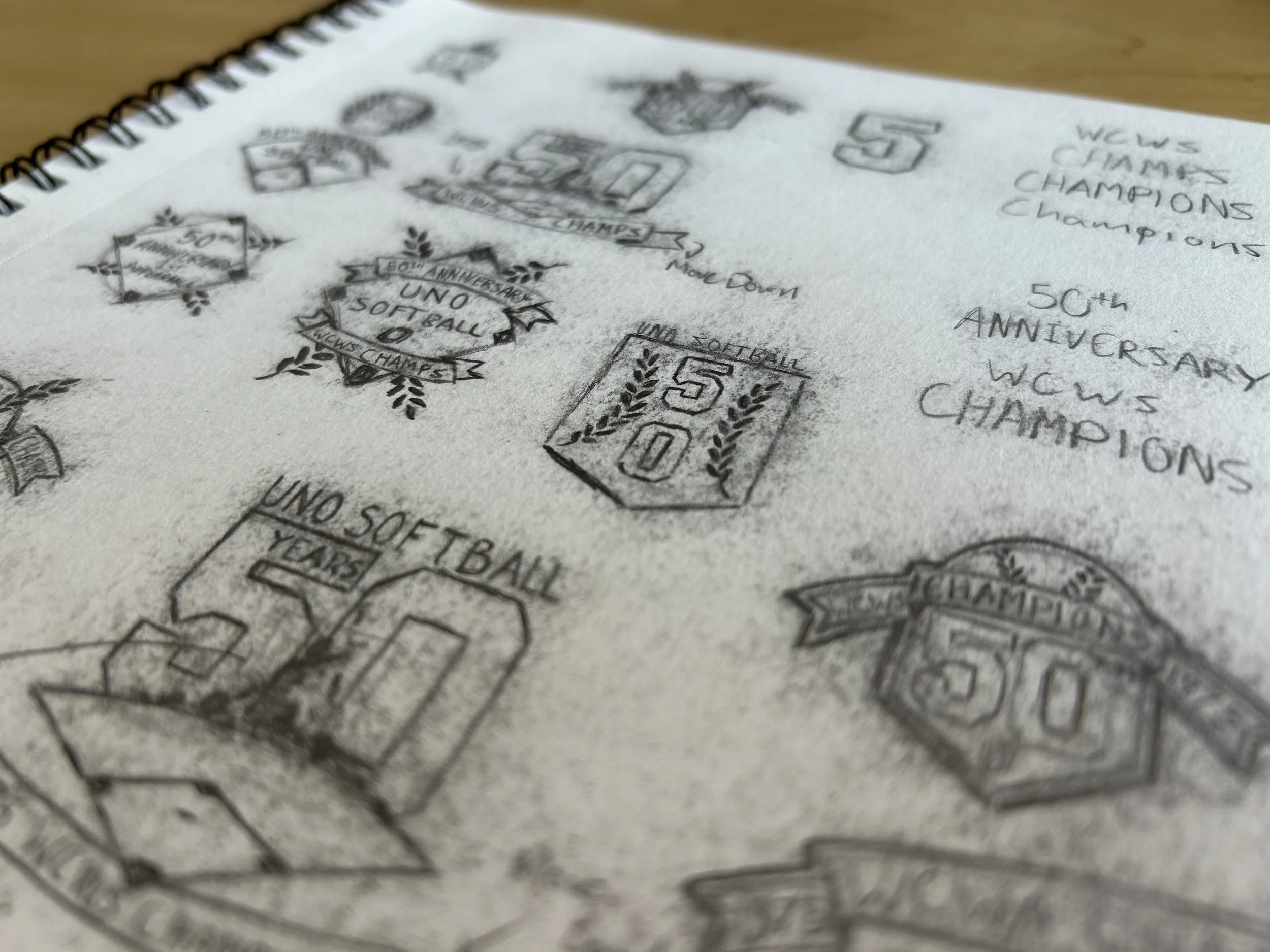One of the greatest honors I’ve had during my time at UNO was to design the 50th Anniversary logo for the 1975 Women’s College World Series Championship team. The project took two months from ideation to completion, March to April of 2025, I worked in close collaboration with UNO Equipment Manager and Associate Athletic Director Bill Sanders to ensure ideal coloration and include pertinent design elements. The logo not only honors the team as a whole, but pays special tribute to Connie Claussen, the renowned coach, athletic director, and foremost champion of UNO Women’s sports. The logo features Claussen’s silhouette on the shoulders of her team, one of the most iconic photos in Mavericks Athletics history. Below it is a series of raised hands, representing the courageous young women who volunteered to play any sport Claussen asked them to, playing combinations of Volleyball, Basketball, and Softball, and some played all three. The gold standard was set in 1975 and their golden anniversary logo needed to live up to what these women accomplished, and seeing them standing proudly in front of it was better than I could have imagined.